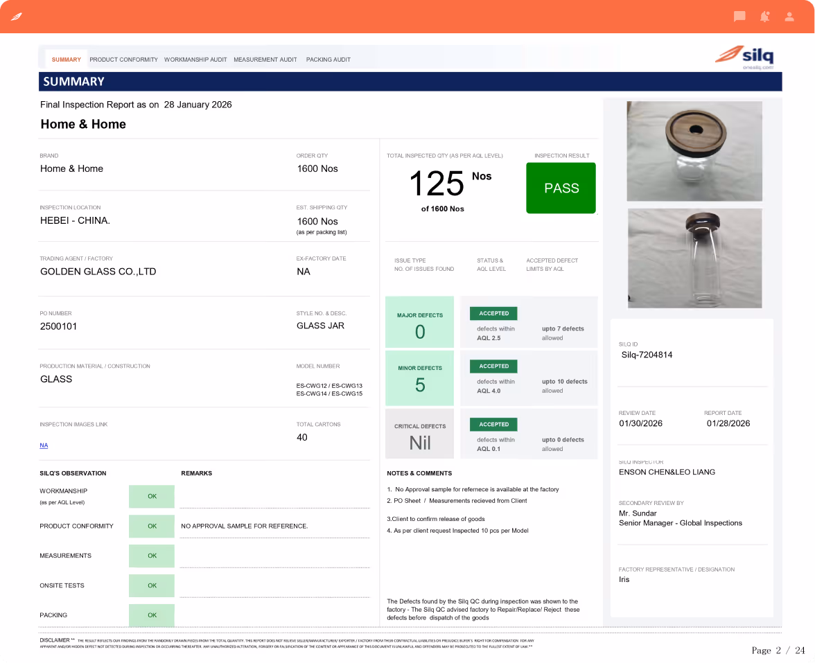 Your inspection report gives you complete visibility into product quality before shipment enabling faster, data-backed decisions aligned with your specifications and AQL standards.