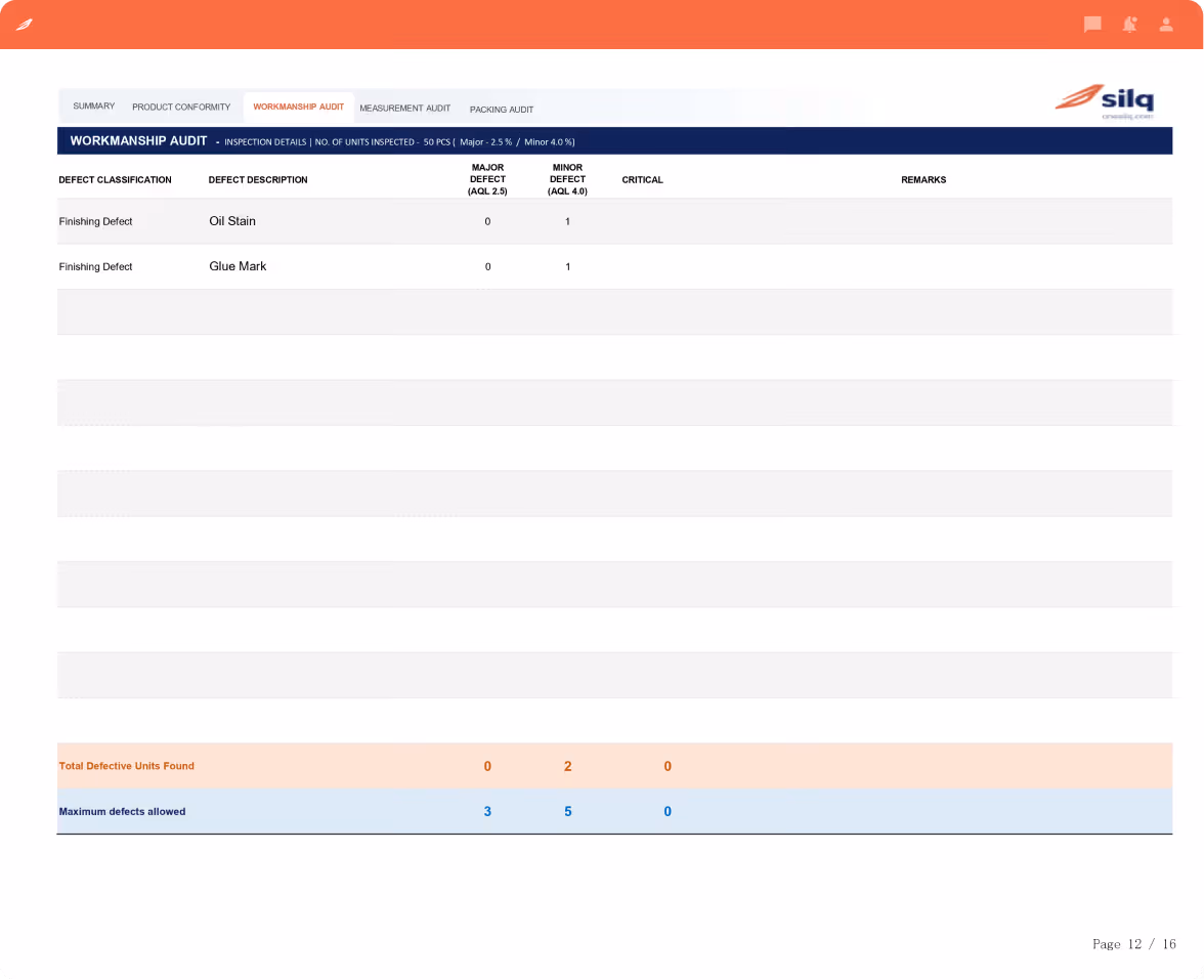 Get a clear overview of inspection results with pass or fail status, along with detailed classification of major and minor defects to support faster shipment decisions.